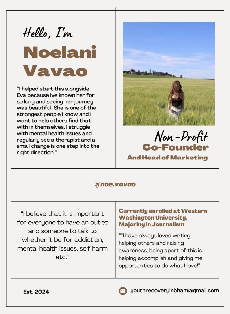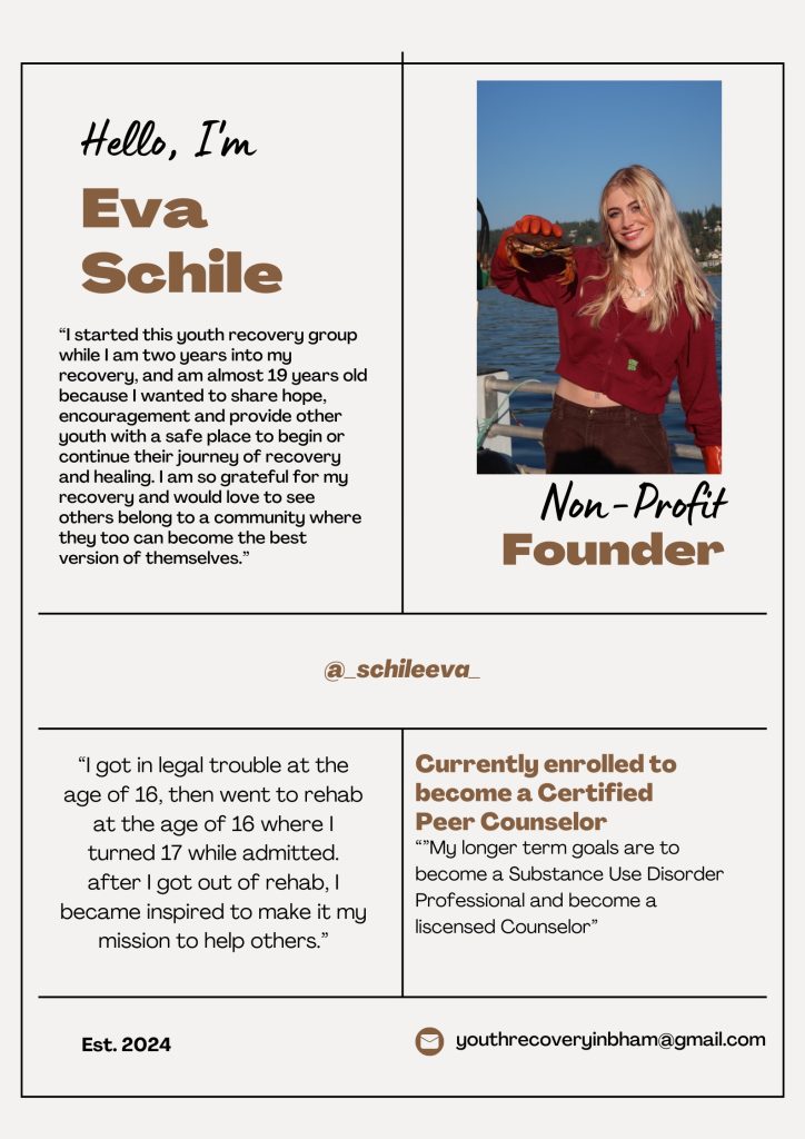 Hello! My name is Eva S., and I am the founder of Youth Recovery Group in Bellingham. This is a group I started at the age of 18 in September of 2024 to support individuals through community and provide encouragement through what may be challenging times.